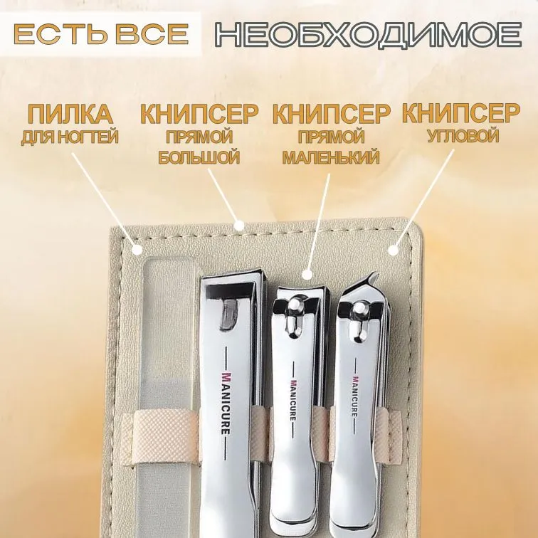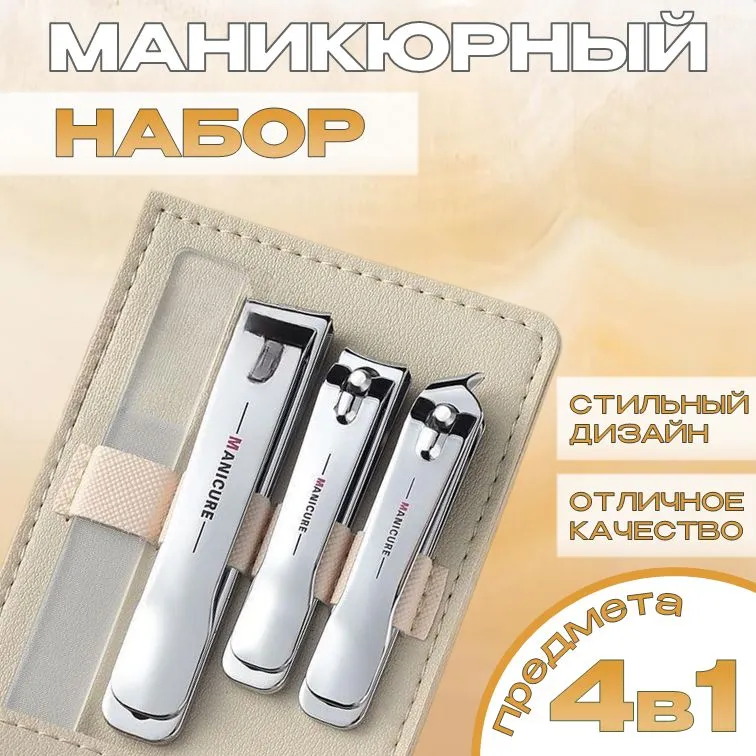 Набір для манікюру та педикюру 4 в 1 у чохлі з еко шкіри, сріблястий / інструменти для нігтів та манікюру